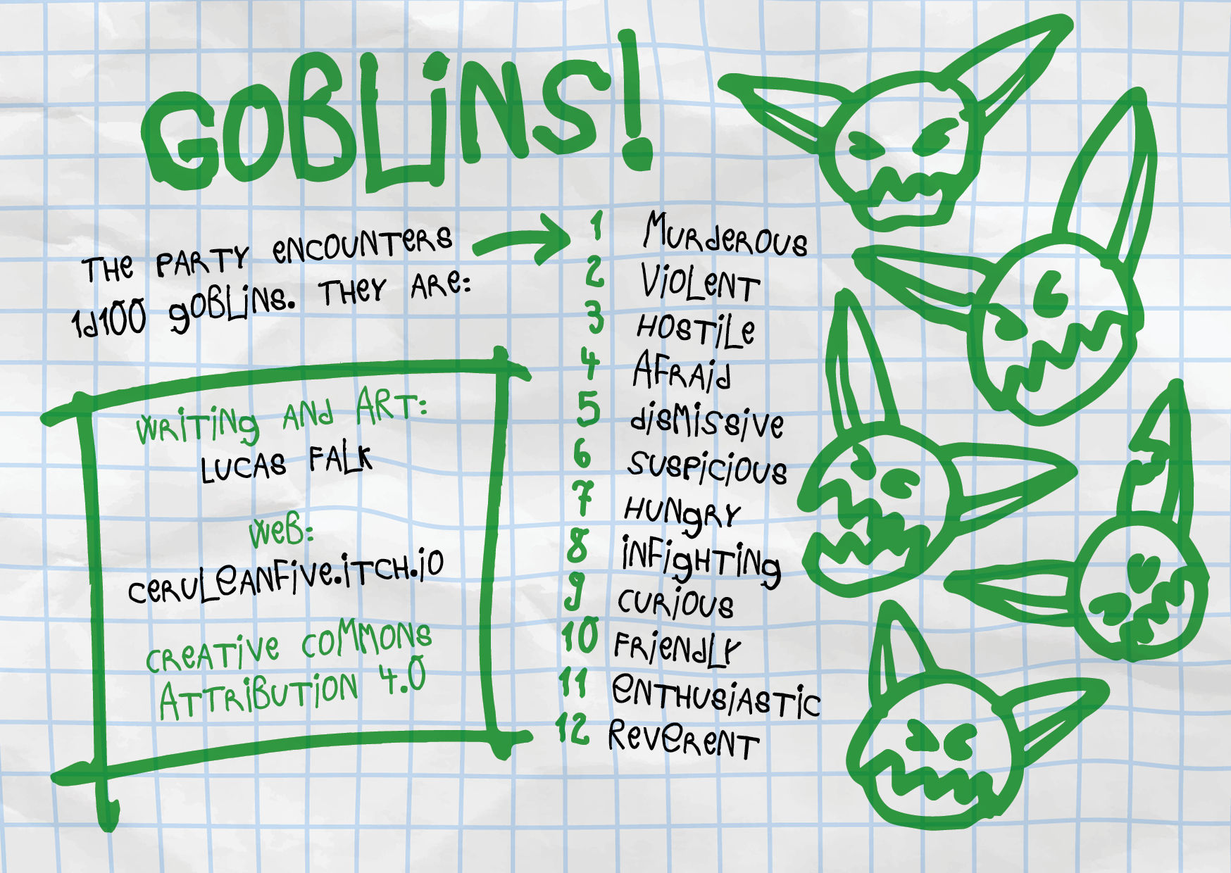 GOBLINS! is a system-agnostic minimalist fantasy adventure. The party encounters 1d100 goblins...