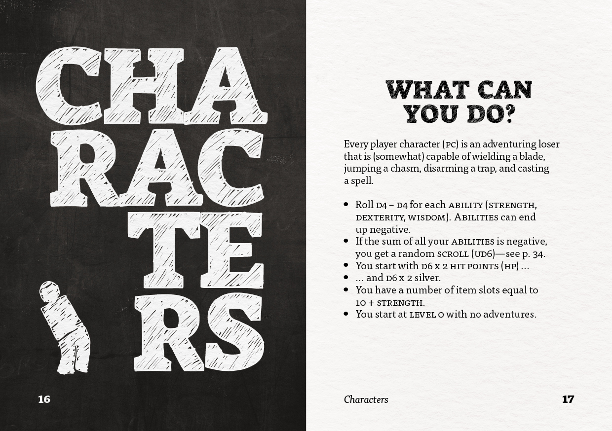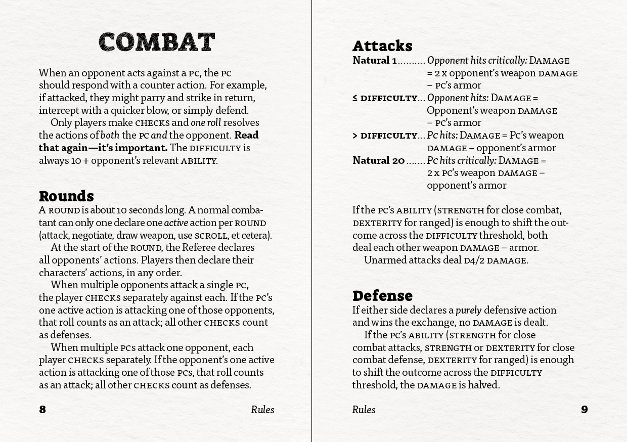 This is a minimalistic tabletop role-playing game reimagining old-school play with player-facing rolls, mixed-result outcomes, and single-roll exchanges. Most OSR adventures and bestiaries should work with minimal conversion.